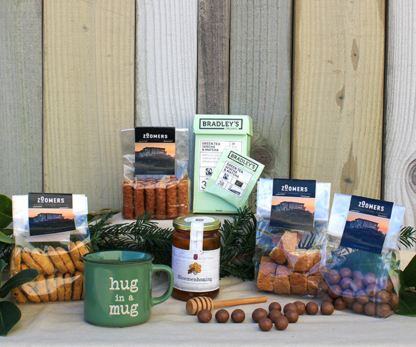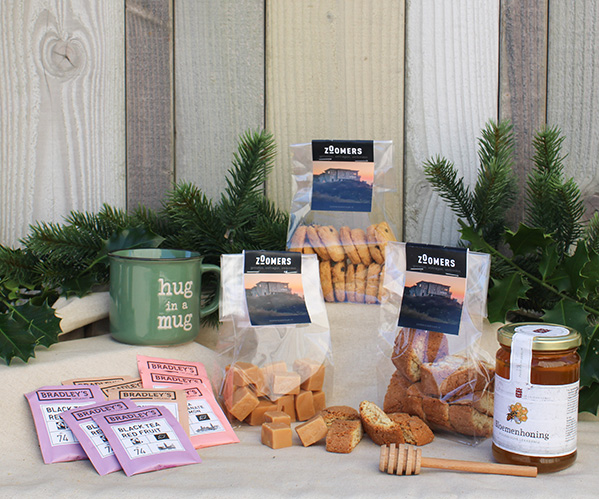 Marienwaerdt Honey | Wooden honey spoon | Bradleys organic tea assortment | Hug in a Mug cup | Zoomers biscuits | Zoomers fudge | Italian cantucinni | A voucher for 10% off an overnight stay at Zoomers